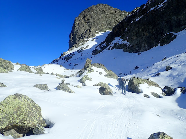 Pourquoi faire simple quand on peut faire compliqué. Nous descendons sur le col de l'Infernet où le peu d'enneigement nous ballade au milieu des barres. Plutôt ludique.